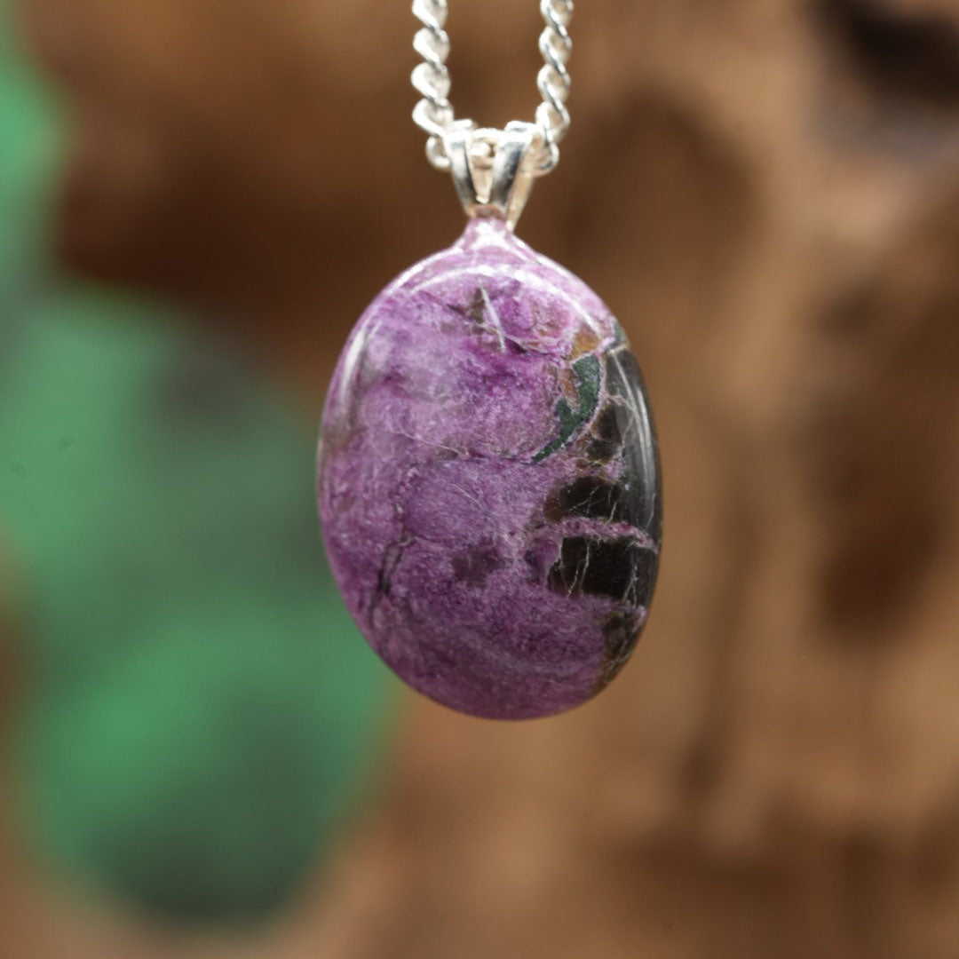 Der elegante Stichtit Anhänger, in einem tiefen Lila-Ton, kommt direkt aus den fernen Landstrichen von Süd-Afrika. Durch die Befestigung an einer edlen 925er Silberöse zeigt er sich nicht nur als schmuckes Accessoire, sondern auch als kraftvoller spiritueller Begleiter. Dieser Heilstein versprüht eine sanfte Kraft, schenkt innere Ruhe und bietet Trost in Momenten der Aufgewühltheit und Sorgen.